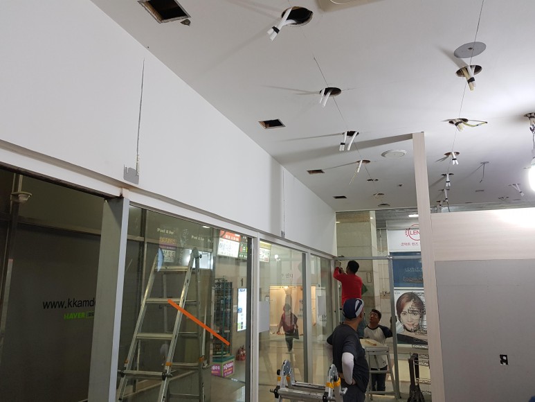 신축 상가건물일 경우 천장이 아무것도 없는 상태일 경우가 많은데 조명은 필수적인 요소이므로 뭘 해도 전기배선작업이 필요하게 되고 가급적이면 택스로 하든 석고를 치든 천장 공사를 하는게 좋습니다.