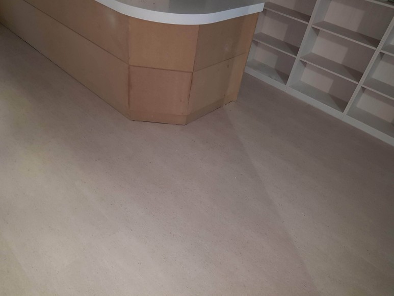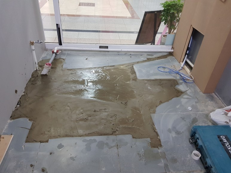바닥은 450각 데코타일을 시공할 계획입니다. 그냥 덮기만 하면 되기는 하는데 바닥 파손 구역이 일부라도 있다면 일반몰탈을 바르든 수평몰탈을 치든 뭘 깔든지 해서 바닥면이 무조건 평평하게는 만들어야 합니다. 데코타일은 바닥재를 전용접착제로 붙이는 방식이므로 바닥이 울퉁불퉁하면 깔끔하게 나오지도 않거니와 들뜨고 바닥이 떨어지는 현상이 발생합니다. 뭐든 정석대로 하는게 좋습니다. 타일을 깔수도 있겠지만 시공단가 차이가 많기도 하고 무엇보다 시공기간과 기초 작업에 발생하는 작업량이 증가하므로 상황에 맞게 판단하시면 됩니다. 일반적인 중저가형 약국 디자인에서는 저렴하고 빠른 데코타일이 무난합니다.