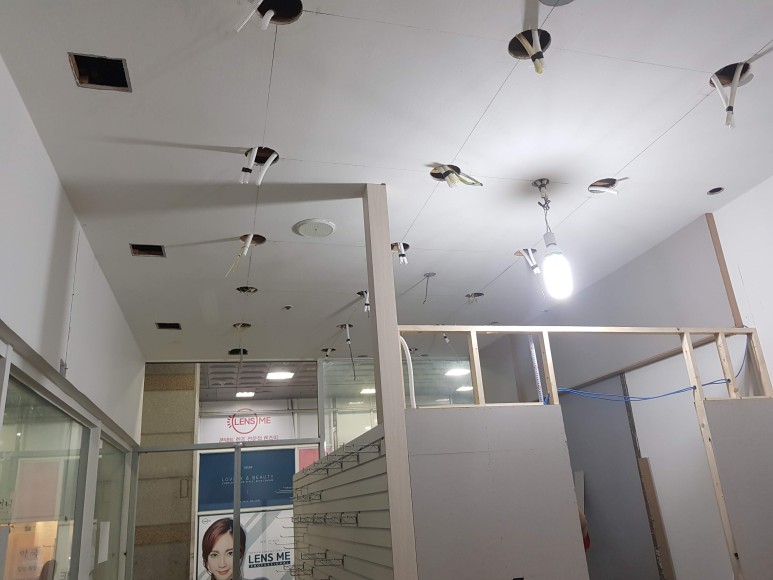 요즘은 약사님들이 굳이 천장 덮을 필요가 없으니 노출천장으로 하자고 하시는 경우가 있기는 합니다. 예시로 든 현장은 기존 천장이 멀쩡해서 조명 위치에 맞게 수정 작업만 하는걸로 처리 되었습니다.