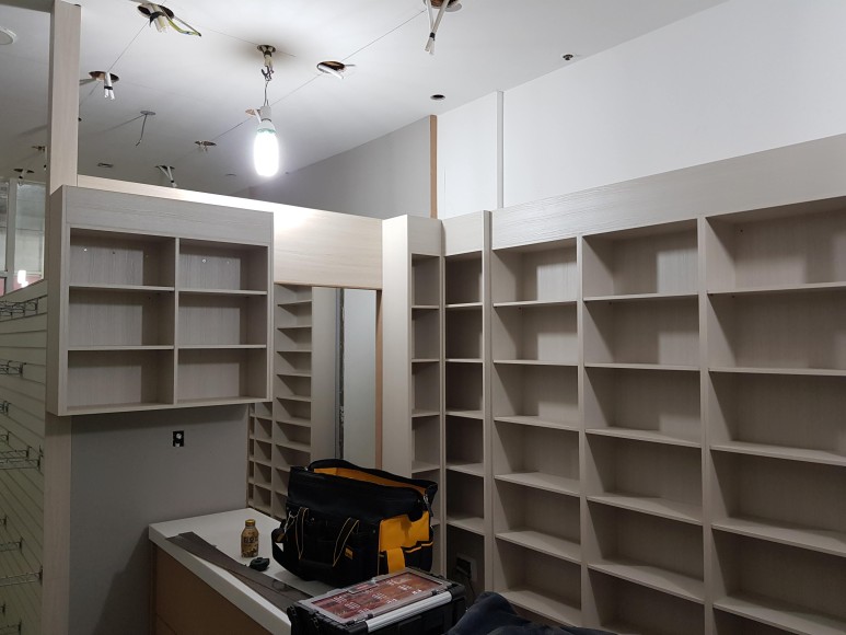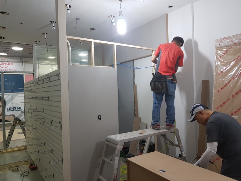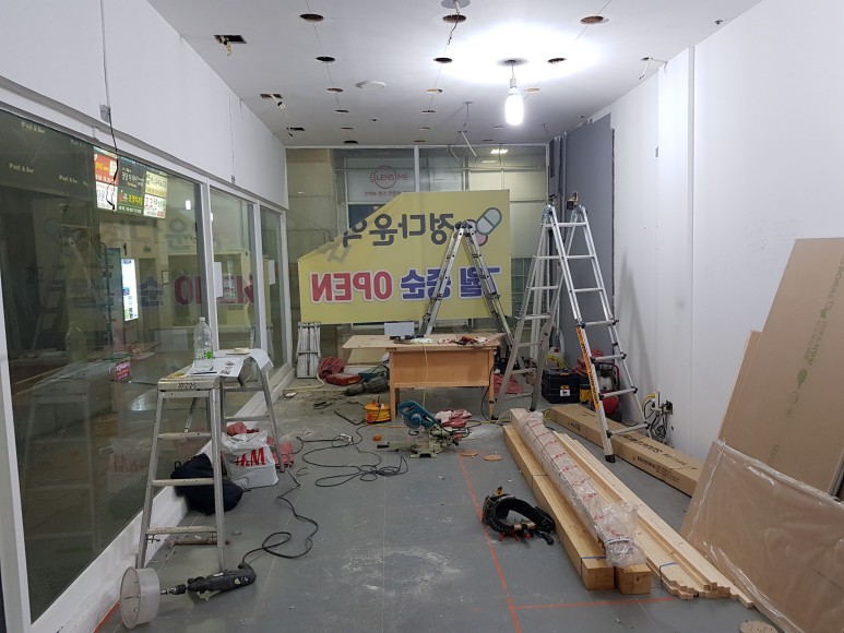 진열대가 되는 벽체도 만들어야 하고 계산대(카운터)와 기타 집기들을 구성하는 구조틀을 조성합니다. 공사 규모에 따라 다르겠지만 20평 정도라면 보통 3~4일 동안 작업이 이루어 집니다. 조제실은 카운터랑 분리가 되어있어야 하고요 커튼을 설치하는 경우가 많습니다.