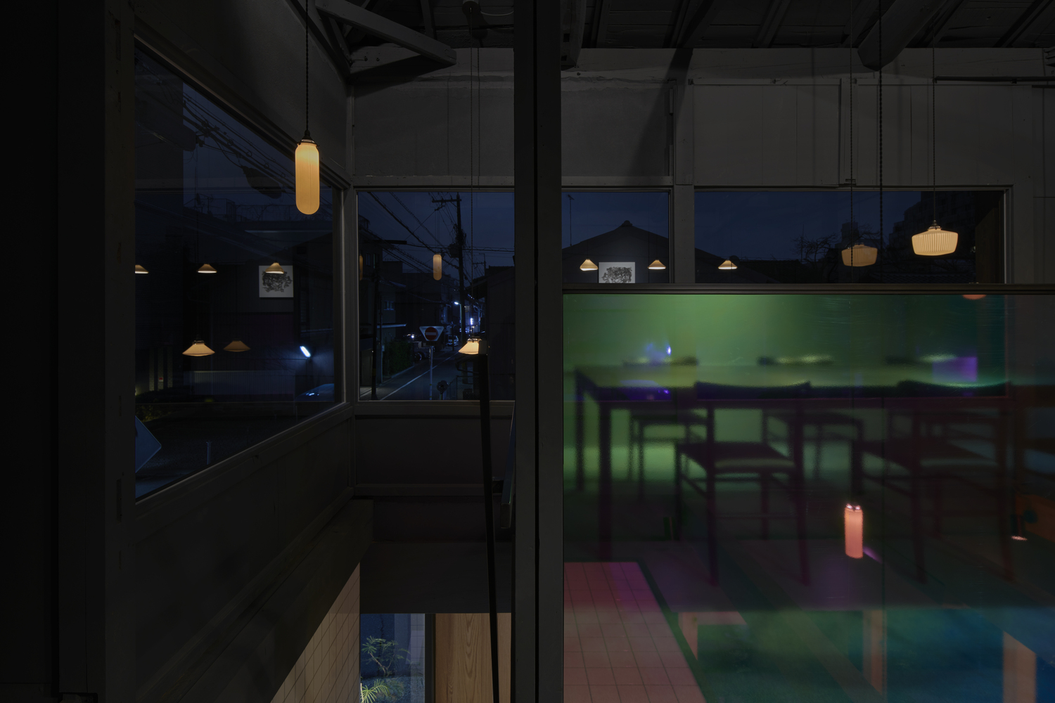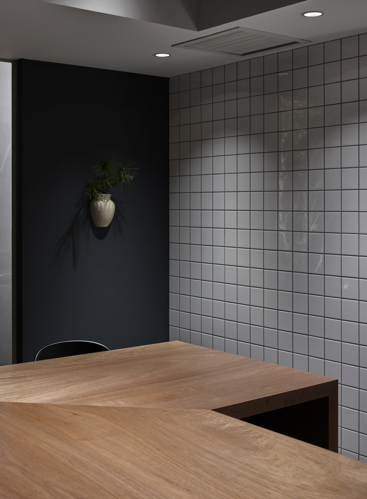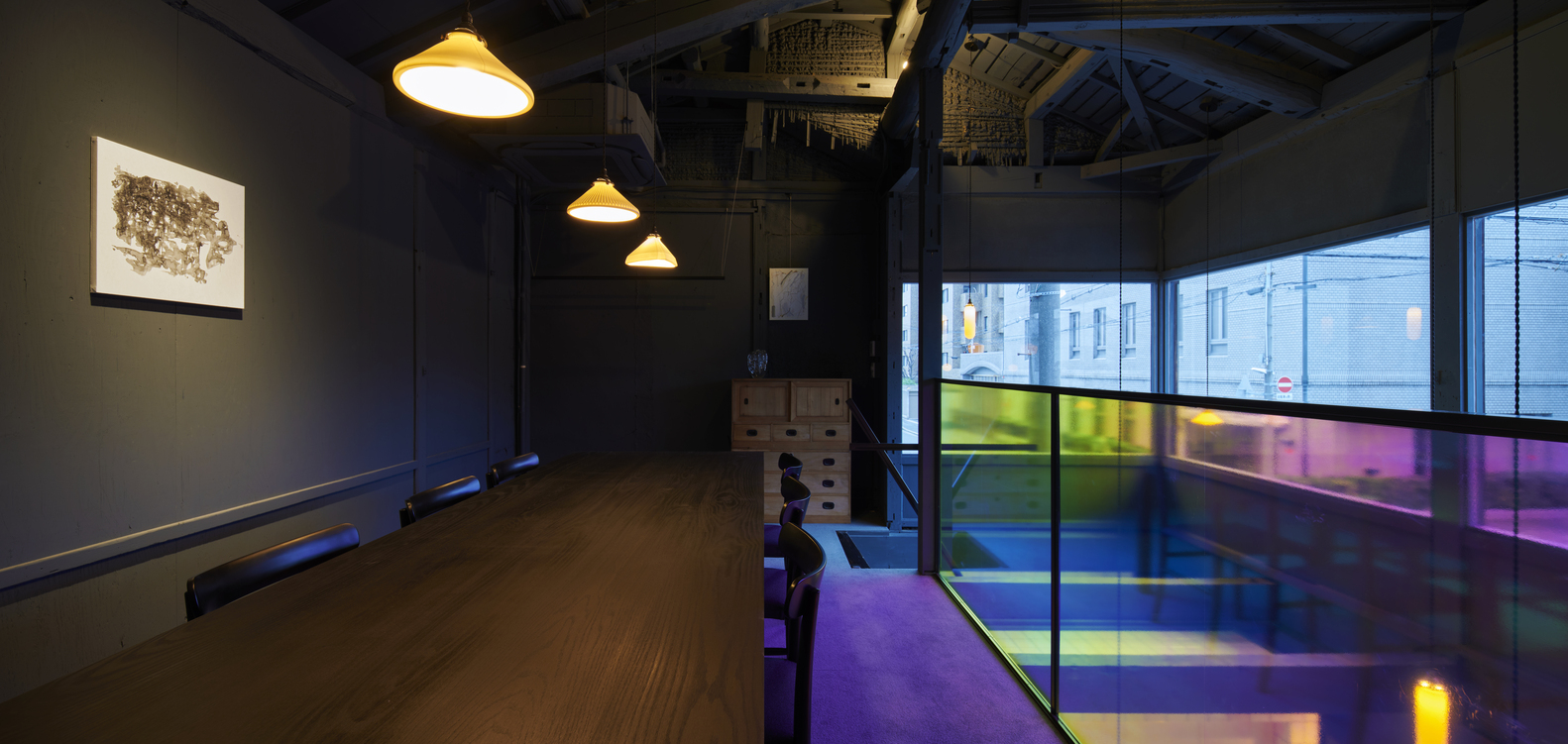 기본적으로 청회색(Nayao Matsumoto의 표현으로는 Dark Blue-Grey)의 컬러톤으로 도장을 하였는데 적절한 조도와 잘 어울리는것 같습니다. 디자이너의 표현으로는 일본의 마찌야(町屋:1층은 가게 2층은 주택인 가게)에서는 잘 쓰지 않는 색이라고는 합니다만 제가 보기에는 건물의 외부의 색감과 잘 어울리는것 같아 선택이 좋았다고 생각합니다.
