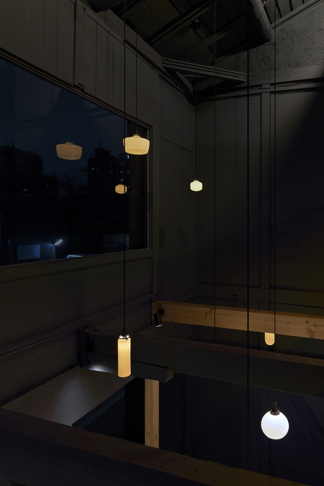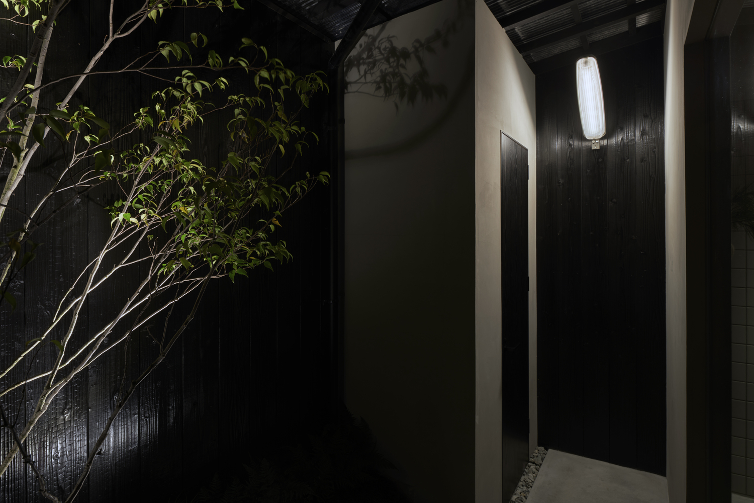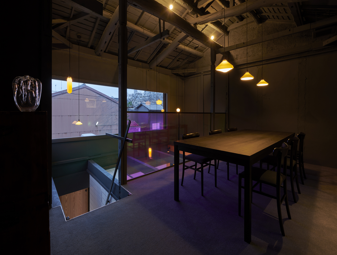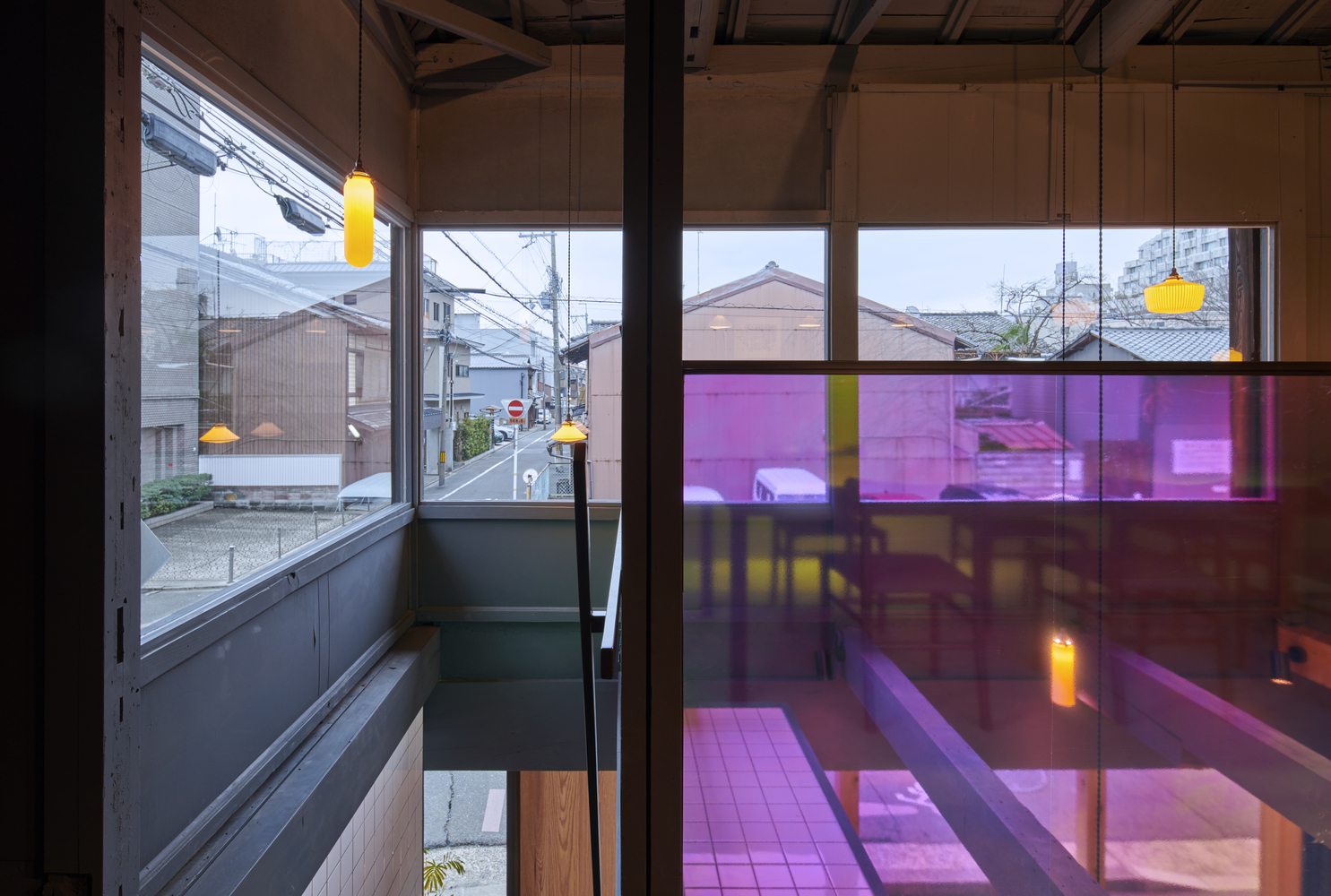 기본적으로 청회색(Nayao Matsumoto의 표현으로는 Dark Blue-Grey)의 컬러톤으로 도장을 하였는데 적절한 조도와 잘 어울리는것 같습니다. 디자이너의 표현으로는 일본의 마찌야(町屋:1층은 가게 2층은 주택인 가게)에서는 잘 쓰지 않는 색이라고는 합니다만 제가 보기에는 건물의 외부의 색감과 잘 어울리는것 같아 선택이 좋았다고 생각합니다.