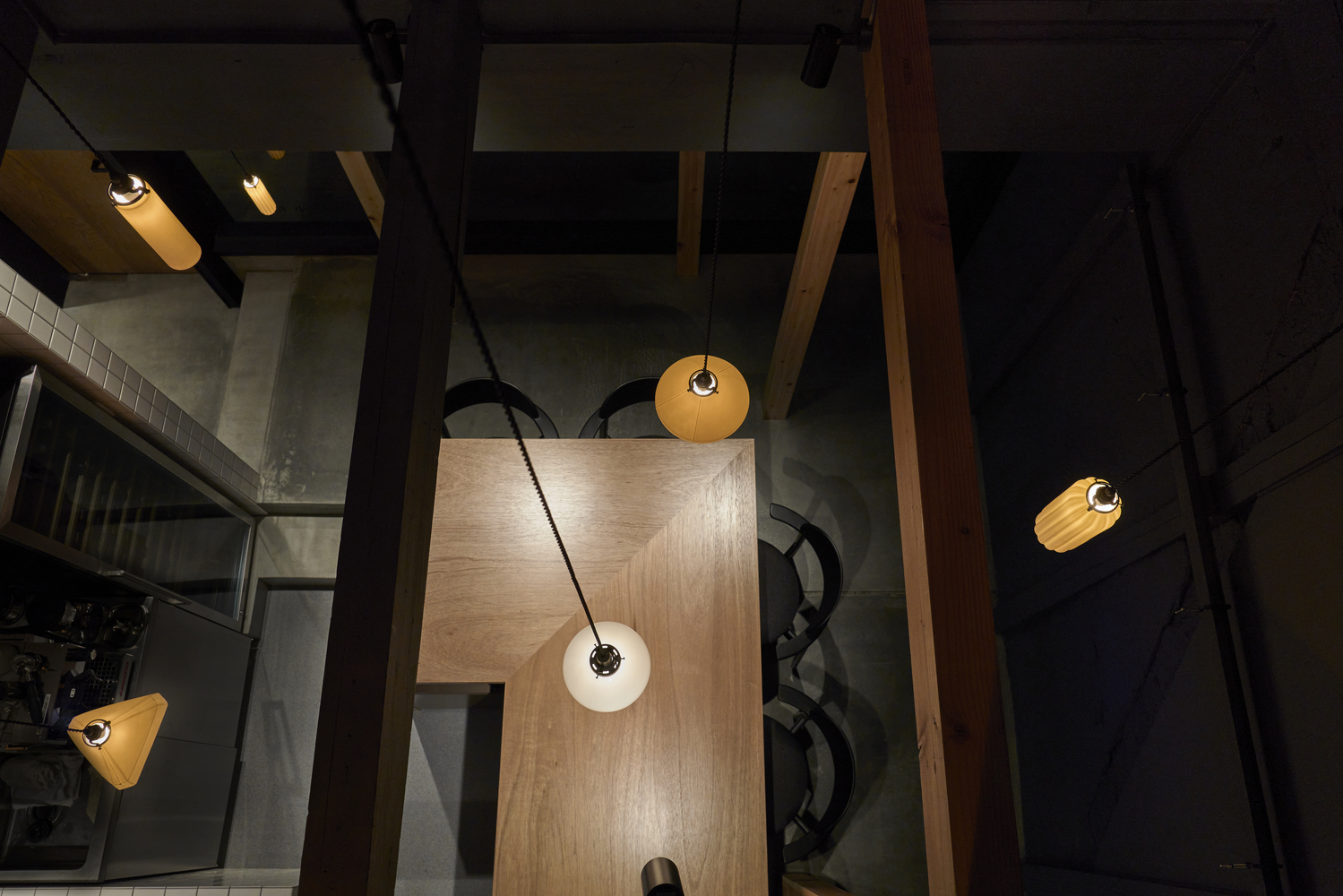중앙 오픈키친의 천장은 과감하게 오픈되어 있는데 여기에 팬던트등(Pendant Light)을 잘 활용하였습니다. 그 중에 하나는 의뢰인의 할머니께서 오랫동안 쓰시던 것을 복원하여 재활용 하였다고 합니다. 그리고 타일과 계단판재는 추억하는 시대와 같은 시대에 유행했던 것들을 선정하여 재현하였다고 합니다.