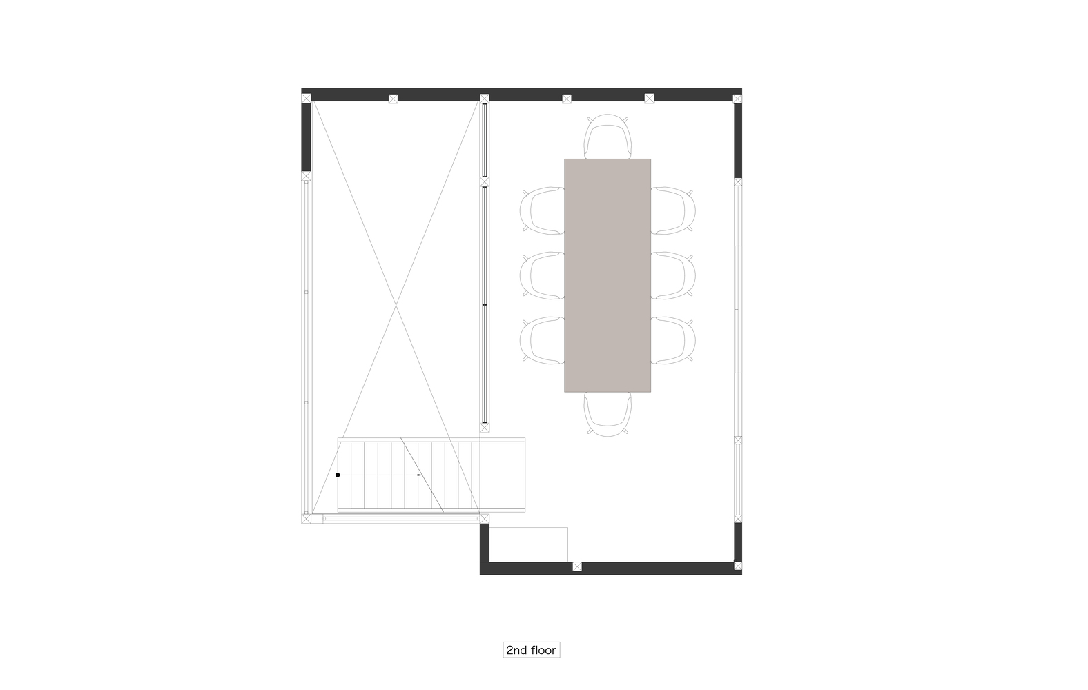 면적은 60㎡로 비교적 작습니다. 그리고 2층이 있는데 계단을 기준으로 옆면은 과감하게 바닥을 없애고 높은 천장을 만들었습니다. 좁은 공간을 더 크고 쾌적한 공간감을 조성하였습니다. 복층구조처럼 만들었는데 이것 또한 과감한 선택이었다고 생각합니다. 바닥이 기존 구조처럼 있었다면 작은 테이블을 하나 더 놓을 수 있었겠지만 아마도 어정쩡한 공간 구조가 되었을 겁니다. 그렇게 했다고 하더라도 테이블간의 간격이 좁아서 각 테이블에 자리잡은 손님들은 식사하기가 서로 불편했을 수 있습니다. 차라리 큰 테이블을 배치하여 프라이빗한 공간을 만들고 예약자들을 위한 전용공간으로 활용하는것이 더 나은 선택이라고 봅니다. 건축주가 요구를 한 것인지 아니면 건축사에서 제안을 한 것인지는 잘 모르겠습니다.