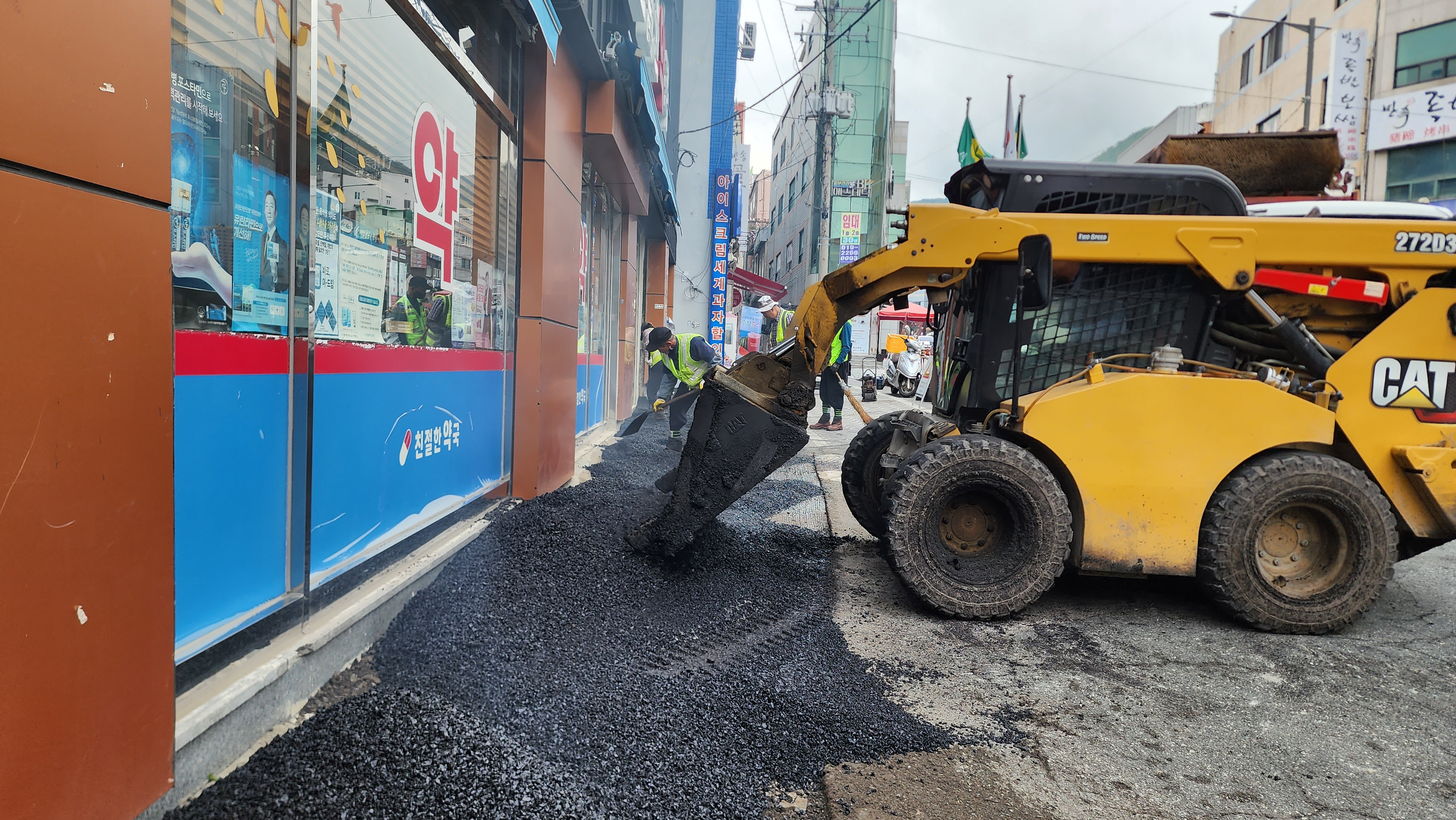 먼저 스키드로더(걍 우리끼리는 '밥캣'이라고 합니다. 원래 밥캣은 그냥 공사장비 브랜드인데....)가 노면을 파쇄합니다. 바닥도 긁어내고 아스콘을 퍼 나르기도 합니다. 이 현장은 미리 기초작업을 잘 해놓아서 바닥을 긁거나 할 일은 많이 없어서작업이 빨리 끝났어요. 일일 사용료는 50만원입니다. 보통은 초반에 많은 활약을 합니다. 바닥표면을 깨고 긁어내는게 중요하거든요.