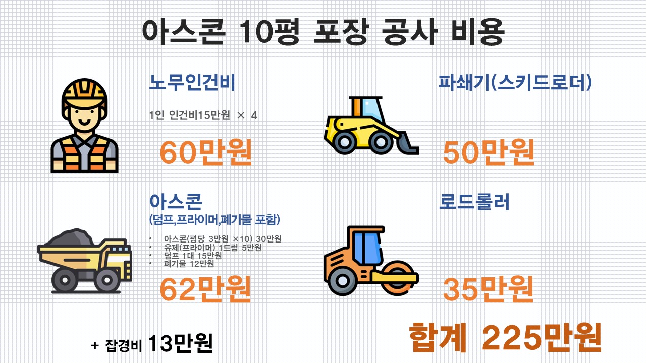 아스콘 포장 공사는 10평기준 200~230만원입니다.