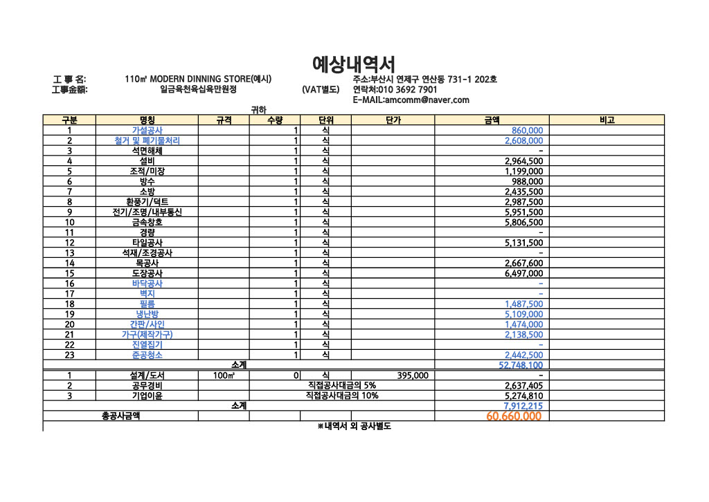 견적서의 디테일 수준을 봐도 업체의 실력이 판가름납니다.